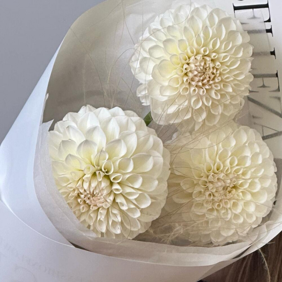 На фото букет из 3 белых георгин. В составе: георгина 3 шт, сухоцветы (микс) 2 шт, дизайнерская упаковка 1 шт, атласная лента 1 шт, . Все цветы свежие и ароматные, букет красиво оформлен и отлично подходит для подарка. Доступна доставка цветов или самовывоз.